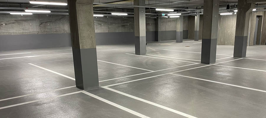 Til gulvene blev Flowcretes parkeringssystem Deckshield ID anvendt. Systemet er udviklet til parkeringskældre med høj trafik og beskytter betonkonstruktionen mod vand, olie og vejsalt, samtidig med at det leverer en skridsikker og slidstærk overflade. Systemet giver desuden mulighed for tydelig farveopdeling og markering af kørselslinjer, parkeringszoner og gangarealer.