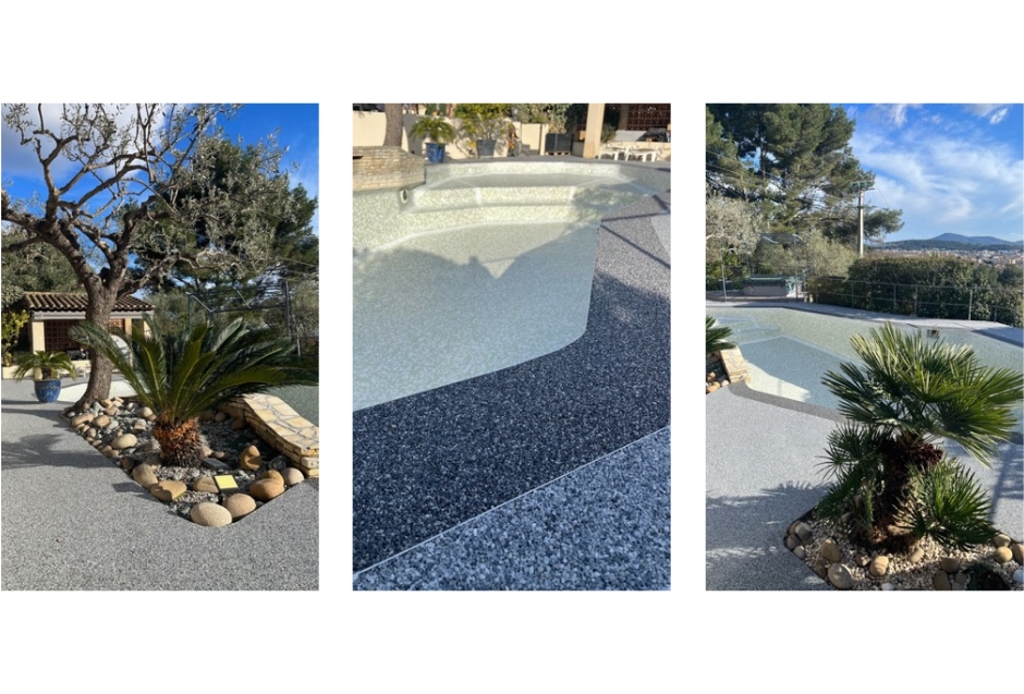 La moquette de pierre est une solution de choix pour les plages de piscine, principalement grâce à son fort pouvoir drainant, de 30 à 50 l/s.m², qui évite les stagnations et flaques d’eau, donc les risques de glissade.