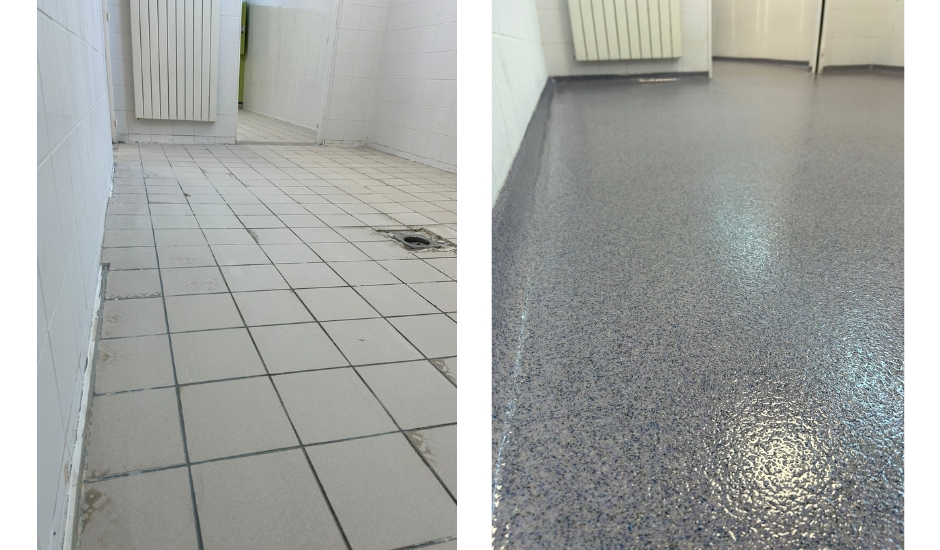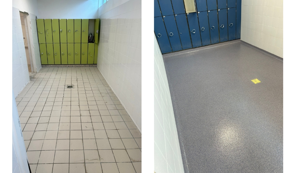 Initialement réalisés en carrelage anti-dérapant, les sols de ces vestiaires avaient perdu au fil du temps à la fois leur esthétique, et surtout leur caractère anti-dérapant. Pour autant ce carrelage était encore bien adhérent, et ne nécessitait pas d’être déposé. En outre, les travaux devaient pouvoir être réalisés durant les congés scolaires, soit en une dizaine de jours.