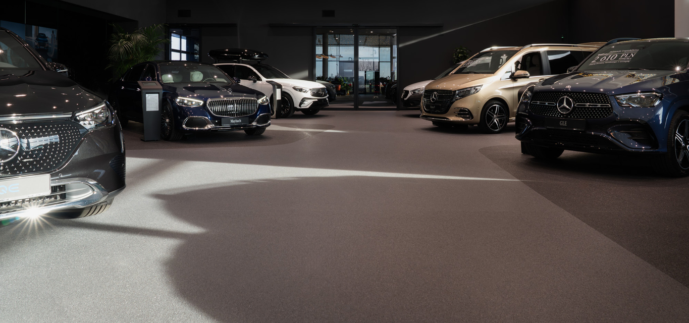 Efektowna posadzka Rustik na 600 m2 w strefie ekspozycji aut„W strefie ekspozycyjnej kluczowe było połączenie estetyki zgodnej ze standardami marki Mercedes-Benz z wysoką trwałością materiału. Zastosowane rozwiązanie spełniło nasze oczekiwania zarówno pod względem wizualnym, jak i użytkowym,” – mówi Michał Salamon, Kierownik ds. Inwestycji w Duda-Cars.