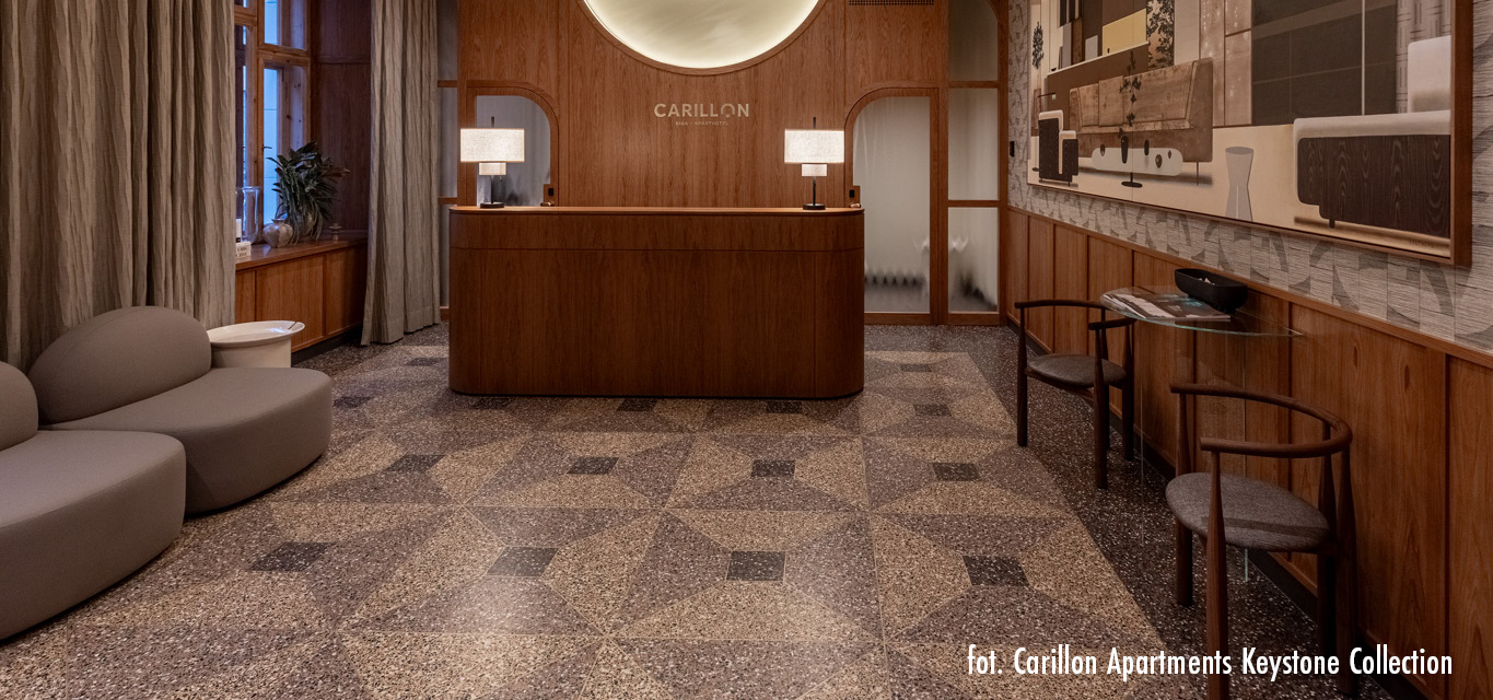 Aparthotel Carillon, elegancki i komfortowy aparthotel położony w centrum Rygi, w rejonie Starego Miasta, łączy inspiracje architekturą secesji i stylistyką Art Déco we wnętrzach. Ten wyjątkowy obiekt został otwarty w grudniu 2025 roku w zabytkowej kamienicy, która przeszła gruntowny remont według projektu firm architektonicznych Vilnis Miculis i Palast Architekts. Wyróżniają go starannie przemyślane i dopracowane detale oraz najwyższa jakość zastosowanych rozwiązań materiałowych. Na powierzchni ponad 140 m2 wykonano w nim efektowną posadzkę marki Flowcrete typu terazzo żywiczne – Mondéco Classic, która w recepcji i lobby zachwyca geometrycznymi wzorami.